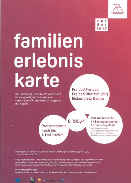 Mit der Familien-Erlebniskarte der Region Vorderland können Familien zu günstigen Preisen ein Jahr lang (eine Saison) bestimmte Freizeitanlagen in der Region Vorderland nutzen.